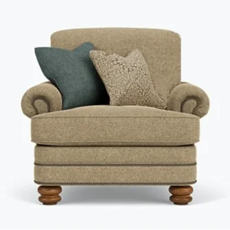 This traditional upholstered chair is one living room accent you will want to consider purchasing. Taking its style from traditional features and bracing it with strong sturdy frames and contemporary design, you'll find this chair a step above the rest in time-less trends and furniture durability. When carefully combining traditional elements with flairs of modernism you receive quality craftsman design in a popular furniture style. Graced with plush seat cushions, low rolled arms and wood carved feet, this living room chair is just one item in a collection of coordinating furniture including a sectional, sofa, loveseat, chair, ottoman and recliner.